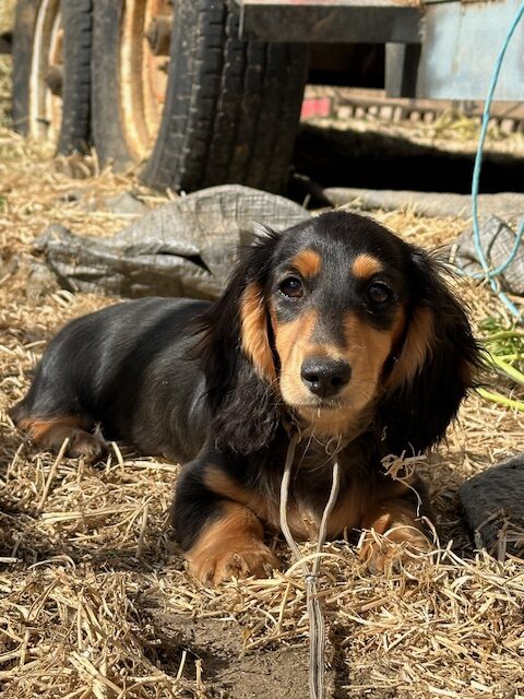 Porter is a black and tan longhair dachshund. She is the ultimate hunter with a very snuggly side too. She is the brains of the operations. After health testing, hopefully we will have porter babies in 2026.